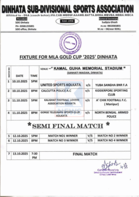 দিনহাটায় শুরু হচ্ছে MLA Cup 2025 ফুটবল টুর্নামেন্ট দিনহাটা, ৪ অক্টোবরঃ দিনহাটা মহকুমা ক্রীড়া সংস্থা (Dinhata Sub-Divisional Sports Association)-এর উদ্যোগে…